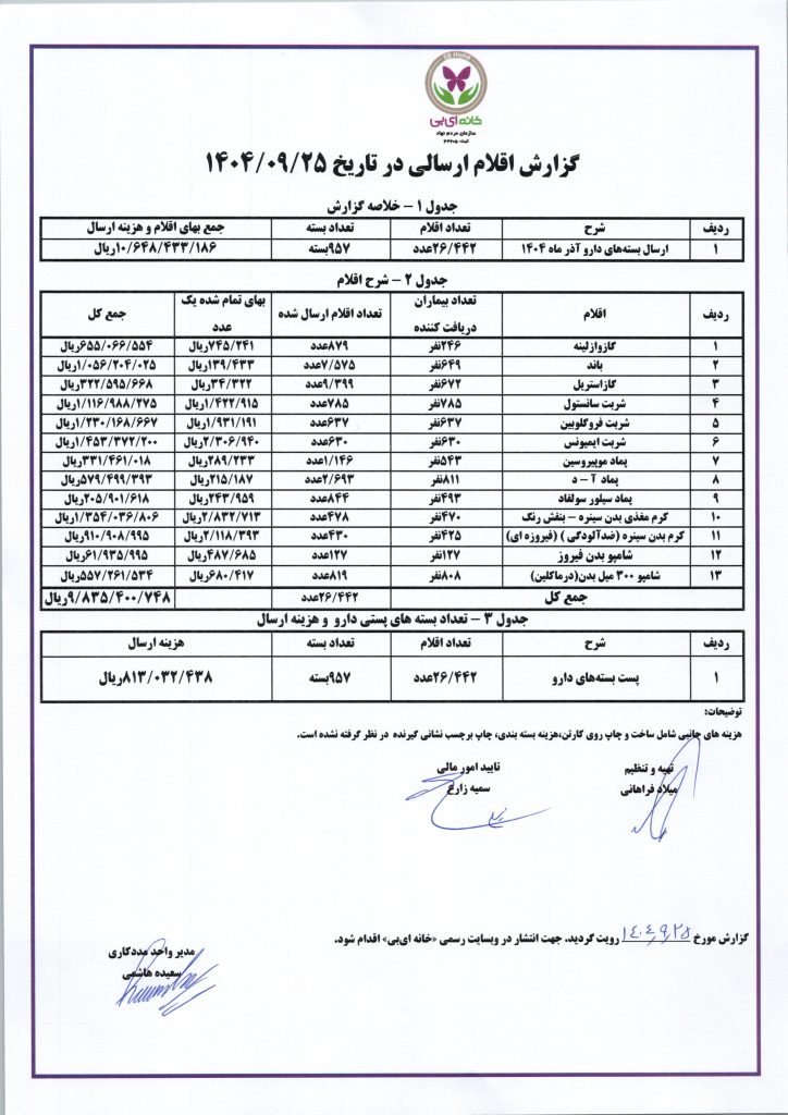 در خانه ای بی ، نیاز های مددجویان توسط واحد مددکاری بررسی شده و بسته های دارویی برای تمام پروانه های عزیزمان در سراسر کشور به شرح ذیل ارسال می شود :