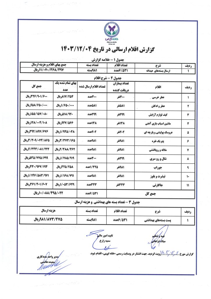 گزارش ارسال اقلام عیدانه و پک بهداشتی به شرح ذیل است: