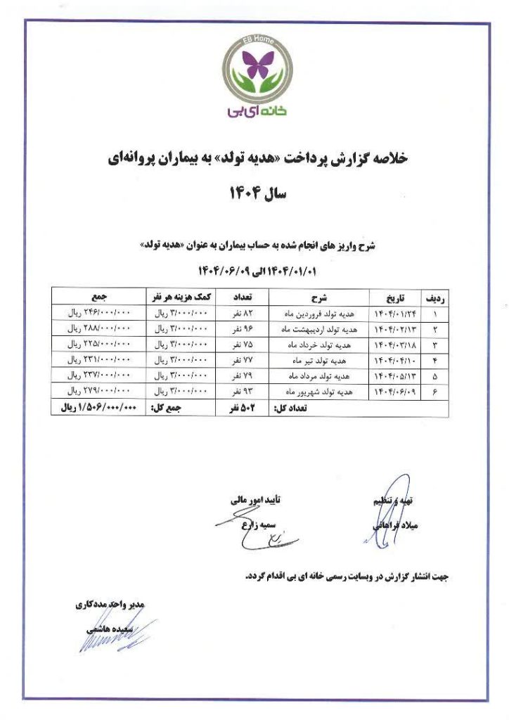 مطابق روال هرسال در کنار شما نیکوکاران عزیز حامی لبخند پروانه های نازنین و دردمند کشورمان هستیم . خانه ای بی به پشتوانه و حمایت نیکوکاران عزیز مبلغی را جهت هدیه تولد به حساب بیماران پروانه ای واریز میکند .